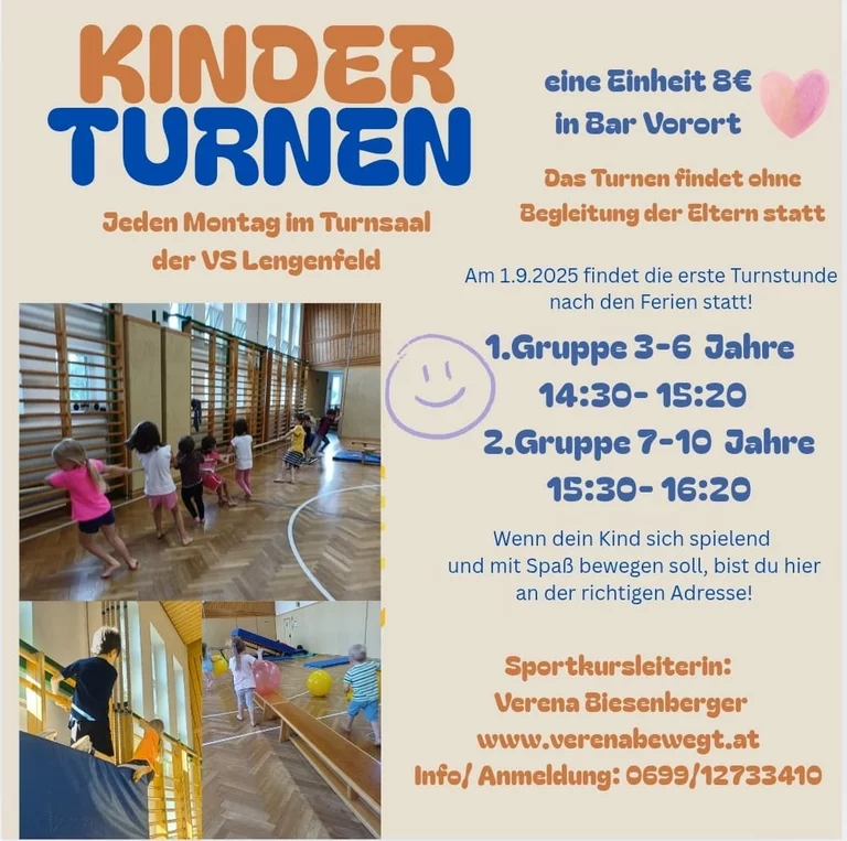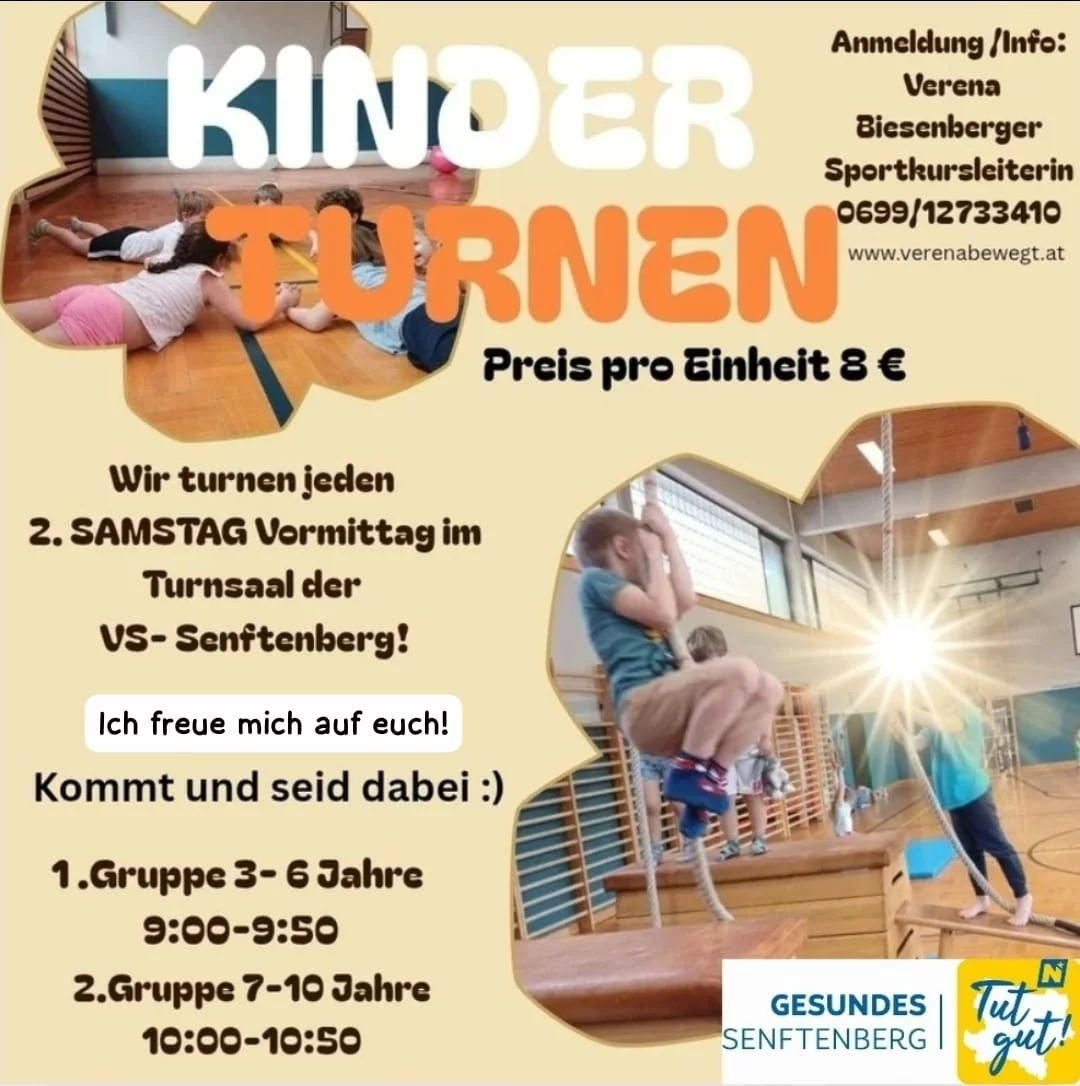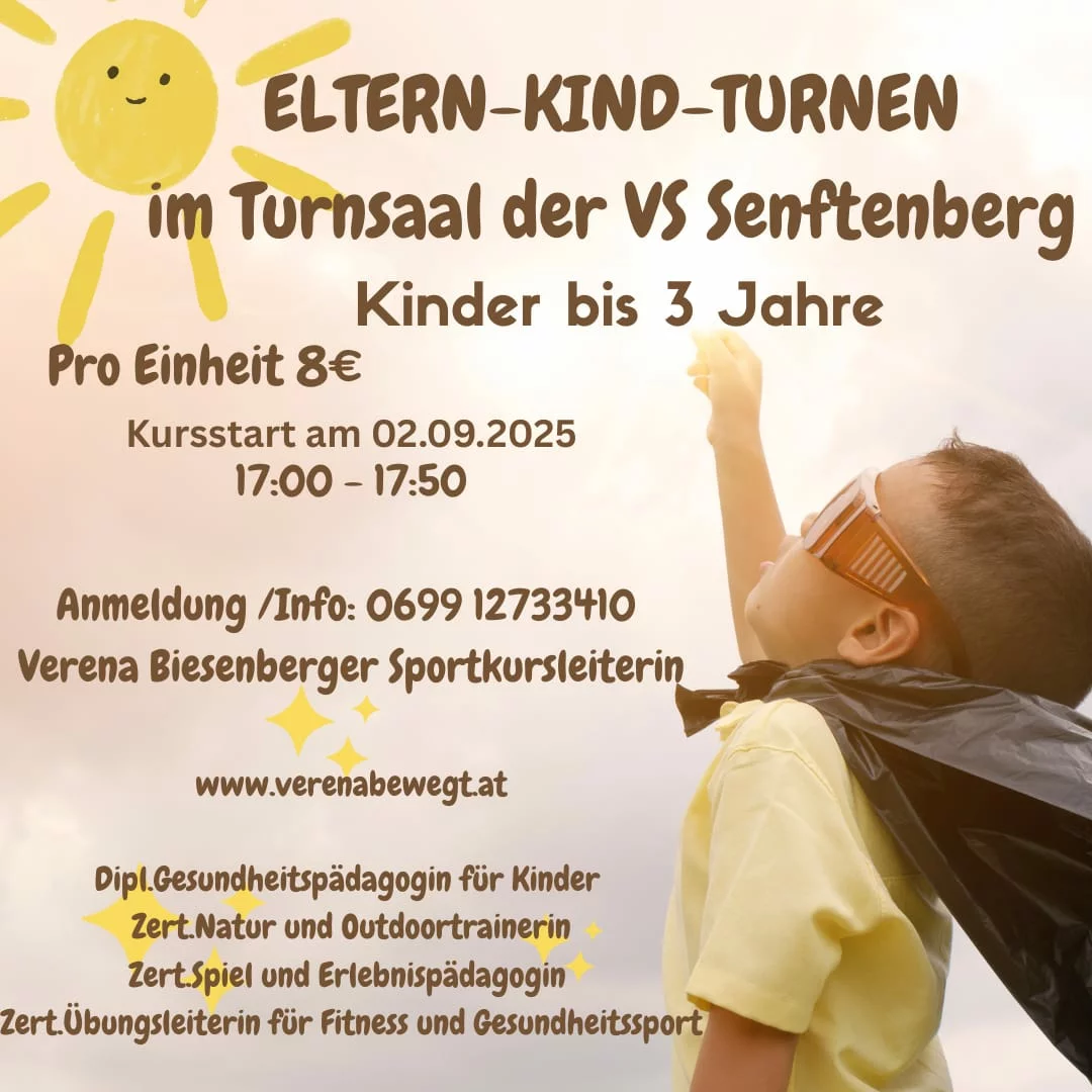 • Eltern-Kind- Turnen: Das Eltern-Kind-Turnen bietet die Möglichkeit, den ersten Sozialkontakt zu gleichaltrigen Kindern aufzubauen. Durch die verschiedensten Bewegungsstationen, die im Turnsaal aufgebaut werden, lernen die kleinsten den eigenen Körper besser kennen und sammeln viele neue Bewegungserfahrungen.